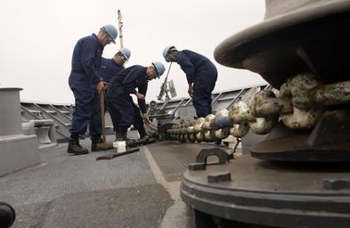 Keywords: US Navy 040513-N-2101W-008 Deck Department Sailors aboard the guided missile cruiser USS Cowpens (CG 63) remove the chain stoppers.jpg en Shimoda Bay Japan May 13 2004 - Deck Department Sailors aboard the guided missile cruiser USS Cowpens CG 63 remove the chain stoppers before anchoring in Shimoda Bay as the crew prepares to participate in the Shimoda Black Ship Festival At right is the wildcat lower part of the capstan used to raise the chain from the locker below The ship and its crew will participate in various events held during the 65th Shimoda Black Ship Festival which celebrates the 150th anniversary of the United Stated and Japan Treaty of Peace In 1854 Japan was opened to the western world which contributed significantly to its rapid modernization U S Navy photo by Photographer's Mate 1st Class Alan Warner RELEASED 2004-05-13 040513-N-2101W-008 Navy http //www navy mil/view_image asp id 14184 U S Navy photo by Photographer's Mate 1st Class Alan Warner PD-USGov-Military-Navy Images from US Navy location Shimoda Bay Japan Anchor chains |