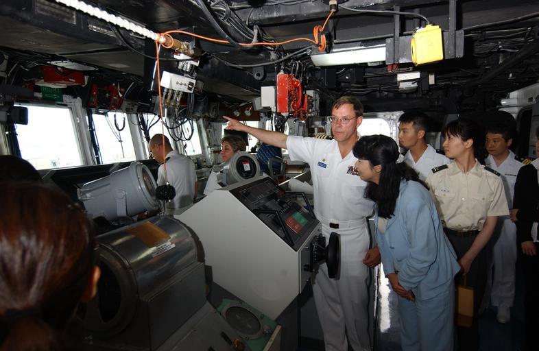 | Keywords: US Navy 040518-N-8590G-041 Commanding Officer Capt. Chris Noble, USS Coronado (AGF 11), describes the state-of-the-art equipment on the bridge to visiting Japanese Maritime Self Defense Force guests.jpg en Commanding Officer Capt Chris Noble USS Coronado AGF 11 describes the equipment on the bridge to visiting Japanese Maritime Self Defense Force JMSDF dentists and guests from U S Naval Dental Center Far East Coronado is forward deployed to Yokosuka as the temporary flagship for Seventh Fleet while USS Blue Ridge LCC 19 undergoes a scheduled dry dock maintenance period 2004-05-18 http //www navy mil/view_image asp id 14603 U S Navy/Photographer's Mate 3rd Class Gary B Granger 040518-N-8590G-041 Navy http //www navy mil/view_image asp id 14603 PD-USGov-Military-Navy United States Fleet Activities Yokosuka Aboard USS Coronado AGF-11 |
