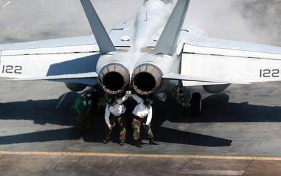 | Keywords: US Navy 040527-N-5549O-086 Aviation Structural Mechanic 3rd Class Matthew Murdock, left, and Aviation Structural Mechanic Equipment 2nd Class Andrew Riojas perform a safety and maintenance check on the tail hook of an F-A-18F S.jpg en South Atlantic Ocean May 27 2004 - Aviation Structural Mechanic 3rd Class Matthew Murdock left and Aviation Structural Mechanic Equipment 2nd Class Andrew Riojas perform a safety and maintenance check on the tail hook of an F/A-18F Super Hornet assigned to the Black Aces of Strike Fighter Squadron Four One VFA-41 aboard USS Ronald Reagan CVN 76 Reagan is underway circumnavigating South America on her way to her new homeport of San Diego Calif U S Navy photo by Photographer's Mate Airman Kevin S O'Brien RELEASED 2004-05-27 040527-N-5549O-086 Navy http //www navy mil/view_image asp id 14666 U S Navy photo by Photographer's Mate Airman Kevin S O'Brien PD-USGov-Military-Navy Maintenance of military aircraft on USS Ronald Reagan CVN-76 Strike Fighter Squadron 41 United States Navy Aviation Structural Mechanic F/A-18F Super Hornet on flight decks |
