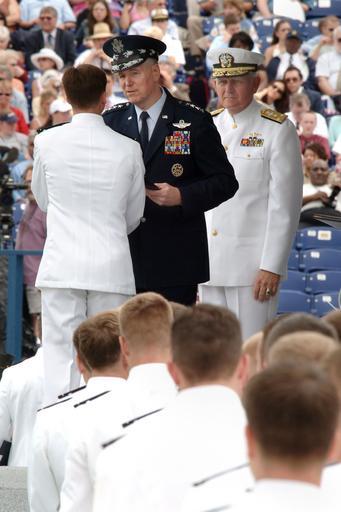 Keywords: US Navy 040528-N-2383B-165 A newly commissioned Ensign receives his diploma from the Chairman of the Joint Chiefs of Staff, Gen. Richard B. Meyers.jpg en U S Naval Academy May 28 2004 - A newly commissioned Ensign receives his diploma from the Chairman of the Joint Chiefs of Staff Gen Richard B Meyers at the U S Naval Academy as the Superintendent of the U S Naval Academy Vice Adm Rodney P Rempt looks on Gen Myers delivered the commencement address and personally greeted each graduate during the ceremony The men and women of the graduating class were sworn into the Navy as Ensigns or into the Marine Corps as Second Lieutenants U S Navy photo by Chief Photographer's Mate Johnny Bivera RELEASED 2004-05-28 040528-N-2383B-165 Navy http //www navy mil/view_image asp id 14517 U S Navy photo by Chief Photographer's Mate Johnny Bivera PD-USGov-Military-Navy Richard Myers Graduation and Commissioning Ceremony May 28 2004 Taken with Fujifilm FinePix S2 Pro Rodney P Rempt |