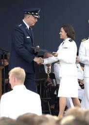 Keywords: US Navy 040528-N-9693M-015 Newly commissioned Ensign Colleen Maloney, from Canton, Ohio, receives her diploma from the Chairman of the Joint Chiefs of Staff Gen. Richard B. Meyers at the U.S. Naval Academy.jpg en U S Naval Academy May 28 2004 Newly commissioned Ensign Colleen Maloney from Canton Ohio receives her diploma from the Chairman of the Joint Chiefs of Staff Gen Richard B Meyers at the U S Naval Academy Maloney received a Bachelors of Science in Oceanography and graduated with 989 classmates Gen Myers delivered the commencement address and personally greeted each graduate during the ceremony The men and women of the graduating class were sworn into the Navy as Ensigns or into the Marine Corps as Second Lieutenants Six hundred sixty-one graduates chose to continue their career as Naval officers Maloney was the only Oceanography major U S Navy photo by Photographer's Mate 2nd Class Damon J Moritz RELEASED 2004-05-28 040528-N-9693M-015 Navy http //www navy mil/view_image asp id 14486 U S Navy photo by Photographer's Mate 2nd Class Damon J Moritz PD-USGov-Military-Navy Taken with Nikon D1X Richard Myers Graduation and Commissioning Ceremony May 28 2004 Handshakes involving the military |
