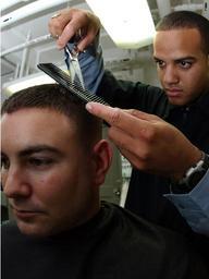 | Keywords: US Navy 040606-N-9319H-082 Ship's Serviceman Seaman Alex Fernandez, from Bronx, N.Y., cuts the hair of Aviation Ordnanceman 3rd Class Reid Ferrero, from Lawrenceville, Ga., in the barbershop aboard USS Ronald Reagan (CVN 76).jpg en South Atlantic Ocean June 6 2004 - Ship's Serviceman Seaman Alex Fernandez from Bronx N Y cuts the hair of Aviation Ordnanceman 3rd Class Reid Ferrero from Lawrenceville Ga in the barbershop aboard USS Ronald Reagan CVN 76 The aircraft carrier with embarked Carrier Air Wing One One CVW-11 is underway in the South Atlantic Ocean circumnavigating South America on her way to her new homeport of San Diego Calif U S Navy photo by Photographer's Mate 3rd Class Angel G Hilbrands RELEASED 2004-06-06 040606-N-9319H-082 Navy http //www navy mil/view_image asp id 14781 U S Navy photo by Photographer's Mate 3rd Class Angel G Hilbrands PD-USGov-Military-Navy Aviation Ordnanceman Aboard USS Ronald Reagan CVN-76 Ship's Serviceman |