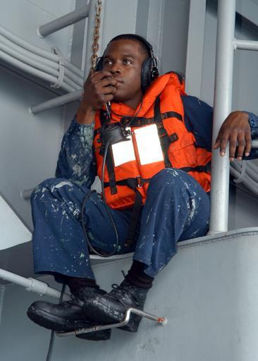 Keywords: US Navy 040609-N-5313A-023 Seaman Kedric Young relays a message to a life raft coxswain during a Search and Rescue drill.jpg en Onslow Bay N C Jun 9 2004 Seaman Kedric Young relays a message to a life raft coxswain during a Search and Rescue drill aboard the amphibious assault ship USS Kearsarge LHD 3 Kearsarge is surged deployed to transport elements of the 24th Marine Expeditionary Unit Air Combat Element to the Central Command Area of Responsibility in support of Operation Iraqi Freedom OIF and the Global War on Terrorism U S Navy photo by Photographer s Mate Airman Sarah E Ard RELEASED 2004-06-09 040609-N-5313A-023 Navy http //www navy mil/view_image asp id 15022 U S Navy photo by Photographer s Mate Airman Sarah E Ard PD-USGov-Military-Navy Military in North Carolina Aboard USS Kearsarge LHD-3 Males with life jackets |