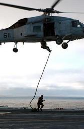 | Keywords: US Navy 040619-N-2788L-208 Members assigned to Explosive Ordnance Disposal Mobile Unit Eleven (EODMU-11) exit an SH-60F Seahawk.jpg en South Pacific Ocean June 19 2004 Members assigned to Explosive Ordnance Disposal Mobile Unit Eleven EODMU-11 exit an SH-60F Seahawk assigned to the Indians of Helicopter Anti-Submarine Squadron Six HS-6 as they execute fast-rope exercises over the flight deck of USS Ronald Reagan CVN 76 Reagan is in the South Atlantic Ocean circumnavigating South America during transit to its new homeport of San Diego Calif U S Navy photo by Photographer's Mate Airman Paul H Laverty Jr RELEASED 2004-06-19 040619-N-2788L-208 Navy http //www navy mil/view_image asp id 15374 U S Navy photo by Photographer's Mate Airman Paul H Laverty Jr PD-USGov-Military-Navy Helicopters at USS Ronald Reagan CVN-76 SH-60F Oceanhawk Fast roping Explosive Ordnance Disposal Mobile Unit 11 Helicopter Anti-Submarine Squadron 6 United States Navy |