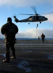 | Keywords: US Navy 040619-N-5549O-074 Members of Explosive Ordnance Disposal (EOD) Mobile Unit 11 embarked aboard the Nimitz-Class aircraft carrier.jpg en Pacific Ocean June 19 2004 Members of Explosive Ordnance Disposal EOD Mobile Unit 11 embarked aboard the Nimitz-Class aircraft carrier USS Ronald Reagan CVN 76 conduct a fast rope training exercise from a SH-60F Seahawk helicopter assigned to the Indians of Antisubmarine Squadron Six HS-6 Reagan is in the South Atlantic Ocean circumnavigating South America during transit to its new homeport of San Diego Calif U S Navy photo by Photographer's Mate Airman Kevin S O'Brien RELEASED 2004-06-19 040619-N-5549O-074 Navy http //www navy mil/view_image asp id 15422 U S Navy photo by Photographer's Mate Airman Kevin S O'Brien PD-USGov-Military-Navy United States Navy Explosive Ordnance Disposal Helicopters at USS Ronald Reagan CVN-76 SH-60F Oceanhawk Fast roping Explosive Ordnance Disposal Mobile Unit 11 |