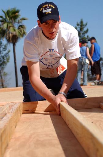 | Keywords: US Navy 040623-N-8252B-067 Airman Apprentice Grant Griffith, from Seattle, Wash., assigned to the Nimitz-class aircraft carrier USS Ronald Reagan (CVN 76), builds a wall.jpg en San Pasqual Calif June 23 2004 - Airman Apprentice Grant Griffith from Seattle Wash assigned to the Nimitz-class aircraft carrier USS Ronald Reagan CVN 76 builds a wall to help the non-profit group Habitat for Humanity build homes for families who lost their houses in the 2003 Southern California Wildfires The ship is currently in transit around South America and is scheduled to arrive in her new homeport of San Diego Calif in late July Airman Griffith is part of an advance team of Reagan personnel making the necessary preparations for the ships arrival U S Navy photo by Photographer s Mate 2nd Class Katrina L Beeler RELEASED 2004-06-23 040623-N-8252B-067 Navy http //www navy mil/view_image asp id 15501 U S Navy photo by Photographer s Mate 2nd Class Katrina L Beeler PD-USGov-Military-Navy Images from US Navy location San Pasqual Calif |