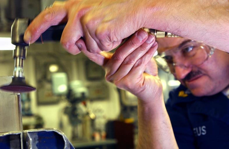 Keywords: US Navy 040624-N-8148A-043 Aviation Structural Mechanic 1st Class Curt Reus, from Colorado Springs, Colo., operates a die grinder.jpg en Pacific Ocean June 24 2004 - Aviation Structural Mechanic 1st Class Curt Reus from Colorado Springs Colo operates a pneumatic sander to smooth the edge of a phone bracket aboard the Nimitz-class aircraft carrier USS Ronald Reagan CVN 76 Reagan is underway circumnavigating South America in transit to her new homeport of San Diego Calif while participating in exercises supporting Summer Pulse 2004 Summer Pulse 2004 is the simultaneous deployment of seven aircraft strike groups CSGs demonstrating the ability of the Navy to provide credible combat across the globe in five theaters with other U S allied and coalition military forces Summer Pulse is the Navy s first deployment under its new Fleet Response Plan FRP U S Navy photo by Photographer's Mate 3rd Class Kitt Amaritnant RELEASED For more information go to <a href http //www cffc navy mil/summerpulse04 htm Target _BLANK >www cffc navy mil/summerpulse04 htm</a> 2004-06-24 040624-N-8148A-043 Navy http //www navy mil/view_image asp id 15715 U S Navy photo by Photographer's Mate 3rd Class Kitt Amaritnant PD-USGov-Military-Navy Aviation Structural Mechanic Aboard USS Ronald Reagan CVN-76 |