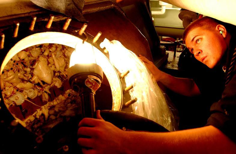 Keywords: US Navy 040629-N-8213G-008 Fireman Billy Radford, from Rigby, Idaho, inspects the number three main condenser aboard USS Ronald Reagan (CVN 76).jpg en Pacific Ocean June 29 2004 Fireman Billy Radford from Rigby Idaho inspects the number three main condenser aboard USS Ronald Reagan CVN 76 The condenser was fouled with several hundred squid and octopi following a four-day port visit to Valparaiso Chile Condensers are used to take in water from the ocean and cool down the ship s engines Reagan is underway circumnavigating South America in transit to her new homeport of San Diego Calif while participating in exercises supporting Summer Pulse 2004 Summer Pulse 2004 is the simultaneous deployment of seven aircraft strike groups CSGs demonstrating the ability of the Navy to provide credible combat across the globe in five theaters with other U S allied and coalition military forces Summer Pulse is the Navy s first deployment under its new Fleet Response Plan FRP U S Navy photo by Photographer's Mate Airman Konstandinos Goumenidis RELEASED For more information go to <a href http //www cffc navy mil/summerpulse04 htm Target _BLANK >www cffc navy mil/summerpulse04 htm</a> 2004-06-29 040629-N-8213G-008 Navy http //www navy mil/view_image asp id 15720 U S Navy photo by Photographer's Mate Airman Konstandinos Goumenidis PD-USGov-Military-Navy Aboard USS Ronald Reagan CVN-76 |