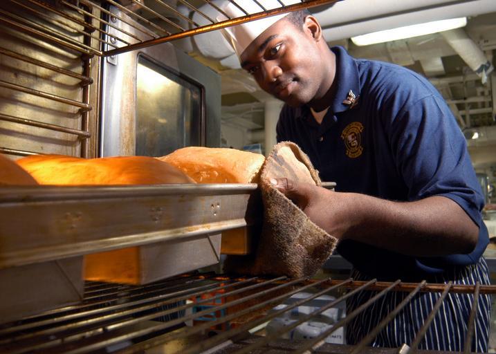 | Keywords: US Navy 040701-N-7748K-016 Culinary Specialist 3rd Class Jermaine Thompson, of Fayetteville, N.C., removes bread from an oven.jpg  en North Sea July 1 2004 - Culinary Specialist 3rd Class Jermaine Thompson of Fayetteville N C removes bread from an oven in one of the enlisted galleys aboard USS Enterprise CVN 65 Enterprise is one of seven aircraft carriers participating in Summer Pulse 2004 Summer Pulse 2004 is the simultaneous deployment of seven aircraft carrier strike groups CSGs demonstrating the ability of the Navy to provide credible combat power across the globe in five theaters with other U S allied and coalition military forces Summer Pulse is the Navy's first deployment under its new Fleet Response Plan FRP U S Navy photo by Photographer's Mate Airman Joshua Kinter RELEASED For more information go to <a href http //www cffc navy mil/summerpulse04 htm Target _BLANK >www cffc navy mil/summerpulse04 htm</a> 2004-07-01 040701-N-7748K-016 Navy http //www navy mil/view_image asp id 15797 U S Navy photo by Photographer's Mate Airman Joshua Kinter PD-USGov-Military-Navy Culinary specialist United States Navy Bread baking |