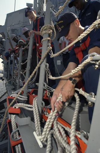 | Keywords: US Navy 040715-N-5862D-244 Boatswain's Mate 3rd Class Ben Gozales from Salt Lake City, Utah, secures the pilots ladder on the port side of the ship while inport at Naval Station Pascagoula, Miss.jpg en Pascagoula Miss July 15 2004 - Boatswain's Mate 3rd Class Ben Gozales from Salt Lake City Utah secures the pilots ladder on the port side of the ship while inport at Naval Station Pascagoula Miss Gonzales is assigned to the deck department aboard the Navy's newest Arleigh Burke-class guided missile destroyer USS Chung-Hoon DDG 93 Chung-Hoon is making preparations to depart the Pascagoula shipyard and steam towards her new homeport in Pearl Harbor Hawaii where she will be officially commissioned later this year U S Navy photo by Chief Photographer's Mate Chris Desmond RELEASED 2004-07-15 040715-N-5862D-244 Navy http //www navy mil/view_image asp id 16534 U S Navy photo by Chief Photographer's Mate Chris Desmond PD-USGov-Military-Navy Aboard Chung-Hoon DDG-93 Naval Station Pascagoula |