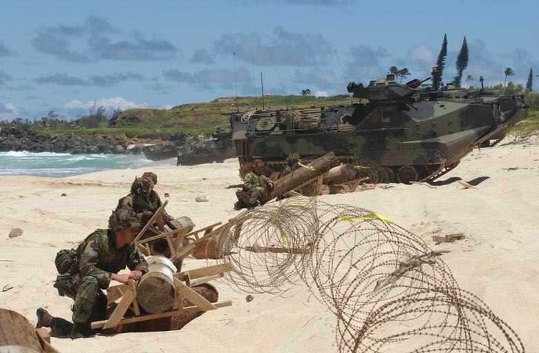 Keywords: US Navy 040718-N-6551H-223 U.S. Marines assigned to 3rd Battalion, 3rd Marine Regiment and their Amphibious Assault Vehicles (AAV) on the beach at Pyramid Rock following a mechanized raid in support of exercise Rim of the Pacif.jpg en Kahuku Training Area Oahu Hawaii July 18 2004 - U S Marines assigned to 3rd Battalion 3rd Marine Regiment and their Amphibious Assault Vehicles AAV on the beach at Pyramid Rock following a mechanized raid in support of exercise Rim of the Pacific 2004 RIMPAC is the largest international maritime exercise in the waters around the Hawaiian Islands This year s exercise includes seven participating nations; Australia Canada Chile Japan South Korea the United Kingdom and the United States RIMPAC is intended to enhance the tactical proficiency of participating units in a wide array of combined operations at sea while enhancing stability in the Pacific Rim region U S Navy photo by Photographer's Mate 1st Class Michelle R Hammond RELEASED For more information go to <a href http //www cpf navy mil/RIMPAC2004 Target _BLANK >http //www cpf navy mil/RIMPAC2004</a>/ http //www navy mil/view_image asp id 16343 Photographer's Mate 1st Class Michelle R Hammond 2004-07-18 PD-USGov-Military-Navy 3d Bn 3d Mar 2004 RIMPAC Marine Corps Base Hawaii Amphibious Assault Vehicle RIMPAC 2004 Kahuku Beach |