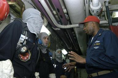 | Keywords: US Navy 040813-N-4565G-001 Damage Control Training Team (DCCT) member Chief Storekeeper John Wynn from Atlanta, Ga., briefs boundary men during a General Quarters drill aboard the aircraft carrier USS John F Kennedy (CV 67).jpg  en Arabian Gulf Aug 13 20004 - Damage Control Training Team DCCT member Chief Storekeeper John Wynn from Atlanta Ga briefs boundary men during a General Quarters drill aboard the aircraft carrier USS John F Kennedy CV 67 Kennedy and Carrier Air Wing Seventeen CVW-17 are on deployment and operating in the Middle East region as part of Operation Iraqi Freedom OIF Units in the Kennedy Carrier Strike Group are working closely with Multi-National Corps-Iraq and Iraqi forces to bring stability to the sovereign government of Iraq U S Navy photo by Photographer s Mate Airman Tommy Gilligan RELEASED Aug 13 20004 040813-N-4565G-001 Navy http //www navy mil/view_image asp id 17060 U S Navy photo by Photographer s Mate Airman Tommy Gilligan PD-USGov-Military-Navy Aboard USS John F Kennedy CV-67 |