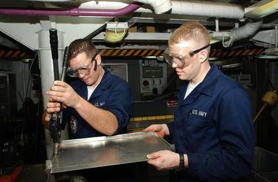 Keywords: US Navy 040818-N-7232R-008 Hull Technician Fireman Glen Reese and Firman Joe Giovanni of Longlot repair an aluminum lid.jpg en Western Pacific Ocean Aug 18 2004 - Hull Technician Fireman Glen Reese of Preston Idaho and Firman Joe Giovanni of Longlot Colo assigned to the Sheet Metal Shop aboard the aircraft carrier USS John C Stennis CVN 74 repairs an aluminum lid Stennis and Carrier Air Wing Fourteen CVW-14 are at sea on a regularly scheduled deployment conducting exercises in the Western Pacific U S Navy photo by Photographer's Mate Airman Ryan J Restvedt RELEASED 2004-08-18 040818-N-7232R-008 Navy http //www navy mil/view_image asp id 17121 U S Navy photo by Photographer's Mate Airman Ryan J Restvedt PD-USGov-Military-Navy Aboard USS John C Stennis CVN-74 |