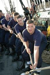 | Keywords: US Navy 040824-N-0335C-005 A group of chief petty officer selectees (CPO) haul a line while setting the jib sail aboard the USS Constitution.jpg en Boston Mass Aug 24 2004 A group of chief petty officer selectees CPO haul a line while setting the jib sail aboard USS Constitution Constitution is the only squared rigged ship in the U S Navy and the oldest commissioned warship afloat in the world Every summer 300 Navy CPO selectees learn to set sails aboard the historic vessel U S Navy photo by Journalist 2nd Class Matt Chabe RELEASED 2004-08-24 040824-N-0335C-005 Navy http //www navy mil/view_image asp id 17214 U S Navy photo by Journalist 2nd Class Matt Chabe PD-USGov-Military-Navy USS Constitution in 21st century Military in Massachusetts Teamwork In United States Navy |