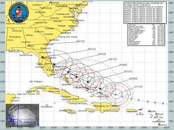 Keywords: US Navy 040901-N-0000X-003 Current forecast projected path and wind speeds of Hurricane Frances from Sept 1 to Sept 6.jpg en Mid-Atlantic Ocean Sept 1 2004 Current forecast projected path and wind speeds of Hurricane Frances from Sept 1 to Sept 6 Frances a category four hurricane on the Saffir-Simpson hurricane scale is approximately 700 miles east-southeast of the Florida East Coast moving at near 14 knots Maximum sustained winds remain near 140 MPH with winds extending outwards up to 80 miles The core of the storm is expected to be near Florida within two days only three weeks after Hurricane Charley left billions of dollars in damage as it swept across the peninsula Photo provided by Naval Atlantic Meteorology and Oceanography Center RELEASED For more information visit <a href http //weather navy mil Target _BLANK >http //weather navy mil</a> 2004-09-01 040901-N-0000X-003 Navy http //www navy mil/view_image asp id 17328 U S Navy photo PD-USGov-Military-Navy Hurricane Frances |