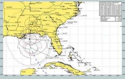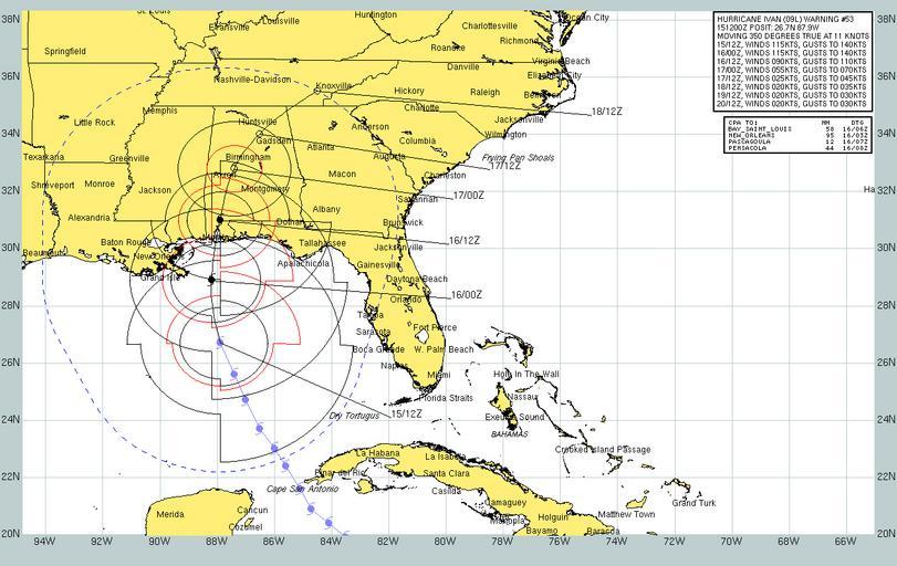 Keywords: US Navy 040915-N-0000X-001 Current forecast projected path and wind speeds of Hurricane Ivan from Sept 15 to Sept 20.jpg en Gulf of Mexico Sept 15 2004 Current forecast projected path and wind speeds of Hurricane Ivan from Sept 15 to Sept 20 Ivan an extremely dangerous category four hurricane on the Saffir-Simpson Hurricane scale has maximum sustained winds near 135 mph with higher gusts Hurricane force winds extend outward up to 105 miles from the center and tropical storm force winds extend outward up to 290 miles The well-defined eye of hurricane Ivan was located about 235 miles south of Mobile Al Hurricane Ivan has killed at least 68 people in the Caribbean and it is expected to make landfall early tomorrow morning between New Orleans La and Apalachicola Fla at approximately 0600 EST Photo provided by Naval Atlantic Meteorology and Oceanography Center RELEASED For more information visit <a href https //weather navy mil Target _BLANK >https //weather navy mil</a> 2004-09-15 040915-N-0000X-001 Navy http //www navy mil/view_image asp id 17664 U S Navy photo PD-USGov-Military-Navy Maps of the Gulf of Mexico
