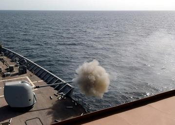 | Keywords: US Navy 041025-N-4374S-001 The guided missile cruiser USS Vicksburg (CG 69) fires a high explosive control variable round from an MK-45 (5-54 caliber) lightweight gun during a live fire exercise in the Arabian Gulf.jpg en Arabian Gulf Oct 25 2004 - The guided missile cruiser USS Vicksburg CG 69 fires a high explosive control variable round from an MK-45 5 /54 caliber lightweight gun during a live fire exercise in the Arabian Gulf The 54-caliber Mk 45 lightweight gun provides surface combatants accurate naval gunfire against fast highly maneuverable surface targets air threats and shore targets during amphibious operations Vicksburg is part of the USS John F Kennedy CV 67 Carrier Strike Group CSG currently on a regularly scheduled deployment in support of Operation Iraqi Freedom OIF U S Navy photo by Photographer s Mate 2nd Class Michael Sandberg RELEASED 2004-10-25 041025-N-4374S-001 Navy http //www navy mil/view_image asp id 18448 U S Navy photo by Photographer s Mate 2nd Class Michael Sandberg PD-USGov-Military-Navy 5 /54 caliber Mark 45 gun firing Aboard USS John F Kennedy CV-67 |