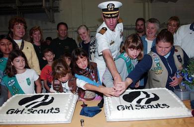Keywords: US Navy 041030-N-8148A-038 Commanding Officer, USS Ronald Reagan (CVN 76), Capt. James Symonds, is assisted by Girl Scouts from the San Diego-Imperial County Council, while cutting a cake to celebrate Girl Scouts founder Juliet.jpg en Naval Air Station North Island Calif Oct 30 2004 - Commanding Officer USS Ronald Reagan CVN 76 Capt James Symonds is assisted by Girl Scouts from the San Diego-Imperial County Council while cutting a cake to celebrate Girl Scouts founder Juliette Low's birthday The celebration was part of Girl Scout Day held aboard Ronald Reagan U S Navy photo by Photographer's Mate 3rd Class Kitt Amaritnant RELEASED 2004-10-30 041030-N-8148A-038 Navy http //www navy mil/view_image asp id 18613 U S Navy photo by Photographer's Mate 3rd Class Kitt Amaritnant PD-USGov-Military-Navy Guests at Naval Air Station North Island James Symonds Guests aboard USS Ronald Reagan CVN-76 Cake cutting Girl Scouts of the USA |