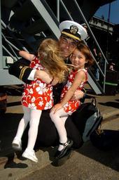 Keywords: US Navy 041101-N-6213R-050 Lt.j.g. Brad Maronde is welcomed home by his daughters after disembarking from the Nimitz-class aircraft carrier USS John C. Stennis (CVN 74) at Naval Air Station North Island in San Diego, Calif.jpg en San Diego Calif Nov 1 2004 - Lt j g Brad Maronde is welcomed home by his daughters after disembarking from the Nimitz-class aircraft carrier USS John C Stennis CVN 74 at Naval Air Station North Island in San Diego Calif Stennis and embarked Carrier Air Wing Fourteen CVW-14 returned home to thousands of awaiting family and friends from a five-month deployment to the Western Pacific Ocean U S Navy photo by Photographer's Mate 3rd Class Mark J Rebilas RELEASED 2004-11-01 041101-N-6213R-050 Navy http //www navy mil/view_image asp id 18706 U S Navy photo by Photographer's Mate 3rd Class Mark J Rebilas PD-USGov-Military-Navy Aboard USS John C Stennis CVN-74 Naval ship arrivals to Naval Air Station North Island Group hugging Military people of the United States with children Sisters Two matching outfits Crouching adults with children Flowered clothing White tights Photographs by Mark J Rebilas Adult with two children Looking at viewer some Hair in movement Red minidresses |