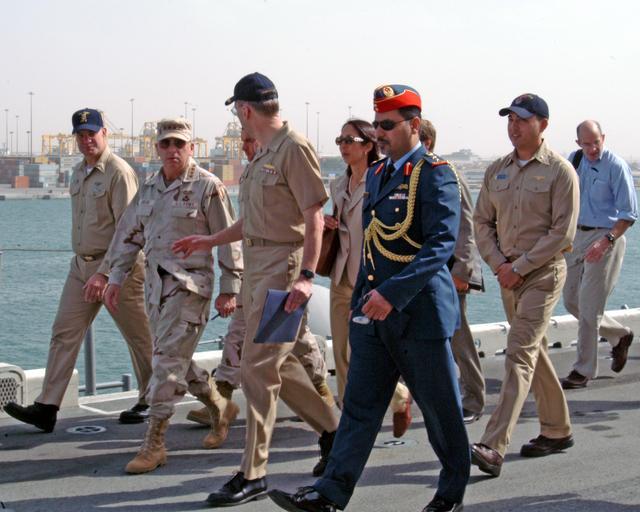 Keywords: US Navy 041129-N-8801B-048 Commander, U.S. Central Command (CENTCOM), John P. Abizaid, U.S. Ambassador to United Arab Emirates (UAE) Michele J. Sison and UAE dignitaries.jpg en Dubai United Arab Emirates Nov 29 2004 Commander U S Central Command CENTCOM John P Abizaid U S Ambassador to United Arab Emirates UAE Michele J Sison and UAE dignitaries take a guided tour aboard the amphibious assault ship USS Essex LHD 2 hosted by Commanding Officer Capt Jan M Van tol The Essex Expeditionary Strike Group ESG is providing security and stability in the Northern Persian Gulf in support of Operation Iraqi Freedom OIF U S Navy Photo by Photographer s Mate Airman Travis M Burns RELEASED 2004-11-29 041129-N-8801B-048 Navy http //www navy mil/view_image asp id 19234 U S Navy Photo by Photographer s Mate Airman Travis M Burns PD-USGov-Military-Navy Images from US Navy location Dubai United Arab Emirates John Abizaid Aiguillette Michele J Sison |