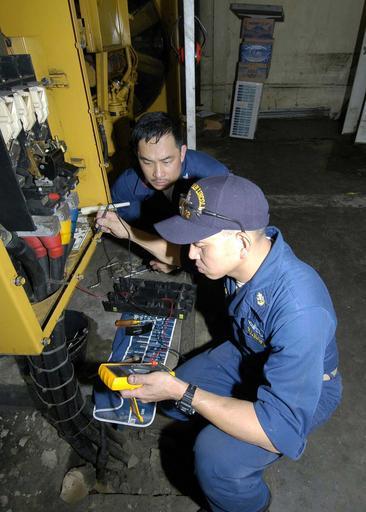 Keywords: US Navy 050106-N-9951E-022 Chief Electrician's Mate Conrad Capindo, foreground, and Electrician's Mate 2nd Class Alex Taliman, work on the emergency diesel power generator behind the main hospital in Aceh, Sumatra, Indonesia.jpg en Aceh Sumatra Indonesia Jan 6 2005 - Chief Electrician's Mate Conrad Capindo foreground and Electrician's Mate 2nd Class Alex Taliman work on the emergency diesel power generator behind the main hospital in Aceh Sumatra Indonesia The hospital was flooded in over four feet of water during the Tsunami that struck December 26 2004 which shorted all electrical power to the hospital Small generators are temporarily being used to provide electricity to some of the vital systems the hospital needs to care for patients The USS Abraham Lincoln CVN 72 Carrier Strike Group is currently operating in the Indian Ocean off the waters of Indonesia and Thailand in support of Operation Unified Assistance U S Navy photo by Photographer's Mate 2nd Class Elizabeth A Edwards RELEASED 2005-01-06 050106-N-9951E-022 Navy http //www navy mil/view_image asp id 20284 U S Navy photo by Photographer's Mate 2nd Class Elizabeth A Edwards PD-USGov-Military-Navy Tsunami in Aceh Electrician's Mate |