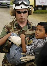 Keywords: US Navy 050106-N-4166B-287 Lt. Shawn Harris, assigned to the guided missile destroyer USS Shoup (DDG 86), carries an injured boy from an MH-60S Knighthawk helicopter to a triage site.jpg en Banda Aceh January 6 2005-1000 - Lt Shawn Harris assigned to the guided missile destroyer USS Shoup DDG 86 carries an injured boy from an MH-60S Knighthawk helicopter to a triage site setup by various relief groups on the Sultan Iskandar Muda Air Force Base in Aceh Sumatra Medical teams from the USS Abraham Lincoln CVN 72 Carrier Strike Group Carrier Air Wing Two CVW-2 and the International Organization for Migration IOM set-up a triage site located on Sultan Iskandar Muda Air Force Base in Banda Aceh Sumatra The two teams worked together with members of the Australian Air Force to provide initial medical care to victims of the Tsunami-stricken coastal regions The Abraham Lincoln Carrier Strike Group is currently operating in the Indian Ocean off the waters of Indonesia and Thailand in support of Operation Unified Assistance U S Navy photo by Photographer s Mate Airman Jordon R Beesley RELEASED January 6 2005-1000 050106-N-4166B-287 Navy http //www navy mil/view_image asp id 20294 U S Navy photo by Photographer s Mate Airman Jordon R Beesley PD-USGov-Military-Navy Banda Aceh Military people of the United States with children |
