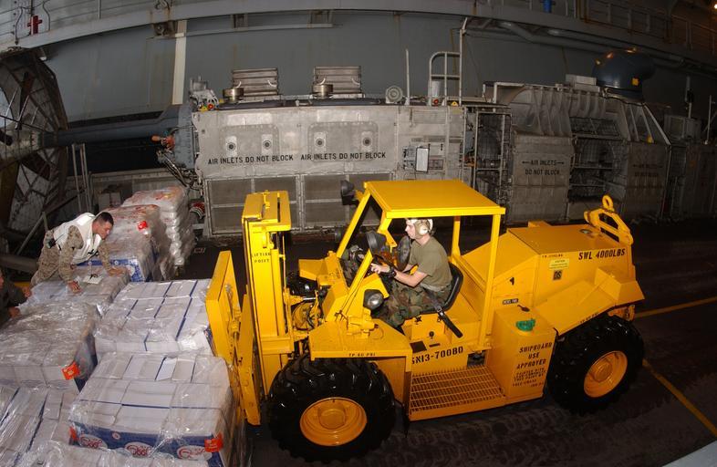 Keywords: US Navy 050110-N-3970R-025 U.S. Marines load relief supplies aboard a Landing Craft Air Cushion (LCAC) in the well deck.jpg en Indian Ocean Jan 10 2005 - U S Marines load relief supplies aboard a Landing Craft Air Cushion LCAC in the well deck aboard the amphibious assault ship USS Bonhomme Richard LHD 6 LCAC's assigned to Assault Craft Unit Five ACU-5 assigned to Bonhomme Richard delivered 34 000 pounds of aid to the Tsunami stricken city of Meulaboh on the island of Sumatra Indonesia The Bonhomme Richard Expeditionary Strike Group is currently operating in the Indian Ocean off the waters of Indonesia and Thailand in support of Operation Unified Assistance the humanitarian operation effort in the wake of the Tsunami that struck South East Asia U S Navy photo by Photographer's Mate 3rd Class Jennifer Rivera RELEASED 2005-01-10 050110-N-3970R-025 Navy http //www navy mil/view_image asp id 20470 U S Navy photo by Photographer's Mate 3rd Class Jennifer Rivera PD-USGov-Military-Navy Landing Craft Air Cushion Aboard USS Bonhomme Richard LHD-6 Military forklifts Well decks |
