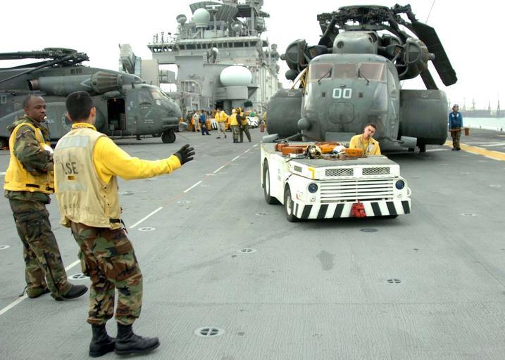 | Keywords: US Navy 050110-N-8801B-300 Aviation Boatswain^rsquo,s Mates guide a tow tractor driver as they park an MH-53E Sea Dragon helicopter, assigned to the Blackhawks of Helicopter Mine Countermeasures Squadron Fifteen (HM-15), on th.jpg  en Persian Gulf Jan 10 2005 - Aviation Boatswain s Mates guide a tow tractor driver as they park an MH-53E Sea Dragon helicopter assigned to the Blackhawks of Helicopter Mine Countermeasures Squadron Fifteen HM-15 on the flight deck aboard USS Essex LHD 2 Essex is undergoing preparations to support Operation Unified Assistance the humanitarian operation effort in the wake of the Tsunami that struck South East Asia U S Navy photo by Photographer s Mate 3rd Class Travis M Burns RELEASED 2005-01-10 050110-N-8801B-300 Navy http //www navy mil/view_image asp id 20486 U S Navy photo by Photographer s Mate 3rd Class Travis M Burns PD-USGov-Military-Navy Aboard USS Essex LHD-2 MH-53E Sea Dragon Helicopter Mine Countermeasures Squadron 15 United States Navy |