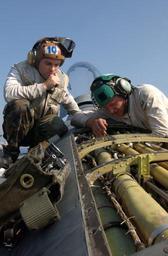 Keywords: US Navy 050113-N-0382O-504 Aviation Electrician's Mate 1st Class Edward Moran, left, oversees maintenance being performed by Aviation Electricians Mate 3rd Class Brandon Pretzer on a connector in the number one turtle back of a.jpg en Persian Gulf Jan 13 2005 - Aviation Electrician's Mate 1st Class Edward Moran left oversees maintenance being performed by Aviation Electricians Mate 3rd Class Brandon Pretzer on a connector in the number one turtle back of an F-14B Tomcat Both Sailors are assigned to the Swordsmen of Fighter Squadron Three Two VF-32 Carrier Air Wing Three CVW-3 is embarked aboard Truman and is providing close air support and conducting intelligence surveillance and reconnaissance missions over Iraq The Truman Strike Group is on a regularly scheduled deployment in support of the Global War on Terrorism U S Navy photo by Photographer's Mate 3rd Class Justin S Osborne RELEASED 2005-01-13 050113-N-0382O-504 Navy http //www navy mil/view_image asp id 21073 U S Navy photo by Photographer's Mate 3rd Class Justin S Osborne PD-USGov-Military-Navy F-14 Tomcat maintenance Fighter Squadron 32 United States Navy Aboard USS Harry S Truman CVN-75 Aviation Electrician's Mate |