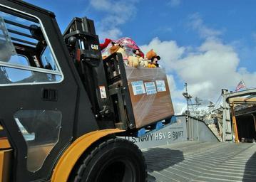 | Keywords: US Navy 050115-N-4995T-171 The last box of donated toys from Operation Keiki Aloha is loaded onto the High Speed Vessel Two (HSV-2) Swift while in port Pearl Harbor, Hawaii.jpg en Pearl Harbor Hawaii Jan 15 2005 - The last box of donated toys from Operation Keiki Aloha is loaded onto the High Speed Vessel Two HSV-2 Swift while in port Pearl Harbor Hawaii Operation Keiki Aloha is the name of a toy donation drive conducted by the Naval Station Pearl Harbor Navy Exchange HSV-2 Swift is currently in port in Pearl Harbor Hawaii prior to arriving in South East Asia in support of Operation Unified Assistance the humanitarian operation effort in the wake of the Tsunami Swift is home ported at Naval Station Ingleside Texas and responded on short notice to meet the needs of the humanitarian and disaster relief efforts U S Navy photo by Photographer's Mate 3rd Class Victoria A Tullock RELEASED 2005-01-15 050115-N-4995T-171 Navy http //www navy mil/view_image asp id 20681 U S Navy photo by Photographer's Mate 3rd Class Victoria A Tullock PD-USGov-Military-Navy Exterior of HSV-2 Swift HSV-2 Swift at Pearl Harbor |