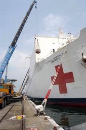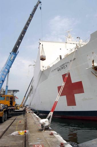 Keywords: US Navy 050129-N-3372S-012 Supplies and medical materials been load onto the Military Sealift Command hospital ship USNS Mercy (T-AH 19).jpg en Singapore Jan 29 2005 - Members of the Naval Expeditionary Logistics Support Force NAVELSF Base Operating Support BOS contractors from the Naval Regional Contracting Center NRCC Singapore and Military Sealift Command mariners load supplies and medical materials onto the Military Sealift Command hospital ship USNS Mercy T-AH 19 Mercy has been forward deployed to support Operation Unified Assistance the humanitarian operation effort in the wake of the tsunami that struck Southeast Asia Mercy contains twelve fully equipped operating rooms a 1 000-bed hospital facility digital radiological services a diagnostic and clinical laboratory a pharmacy an optometry lab a cat scan and two oxygen-producing plants The hospital ship is a converted San Clemente-class super tanker Mercy is a very visible and humanitarian symbol of not only America s commitment to tsunami victims but also its enduring commitment to the people of the region U S Navy photo by Journalist 1st Class Paul G Scherman RELEASED 2005-01-29 050129-N-3372S-012 Navy http //www navy mil/view_image asp id 21318 U S Navy photo by Journalist 1st Class Paul G Scherman PD-USGov-Military-Navy Naval ships of the United States in Singapore American Red Cross Aboard USNS Mercy T-AH-19 |