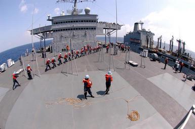 | Keywords: US Navy 050210-N-9860Y-078 Sailors assigned to Deck Department participate in a working party on the main deck of the command ship USS Blue Ridge (LCC 19) during a replenishment at sea.jpg en Indian Ocean Feb 10 2005 Sailors assigned to Deck Department participate in a working party on the main deck of the command ship USS Blue Ridge LCC 19 during a replenishment at sea with the Military Sealift Command MSC underway replenishment oiler USNS Yukon T-AO 202 Blue Ridge is underway for a scheduled deployment U S Navy photo by Photographer's Mate 3rd Class Tucker M Yates RELEASED 2005-02-10 050210-N-9860Y-078 Navy http //www navy mil/view_image asp id 21759 U S Navy photo by Photographer's Mate 3rd Class Tucker M Yates PD-USGov-Military-Navy Underway replenishment Aboard USS Blue Ridge LCC-19 |