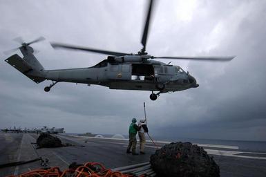 | Keywords: US Navy 050222-N-5781F-151 Supply personnel connect a cargo pendant to an MH-60S Seahawk helicopter, assigned to the Providers of Helicopter Combat Support Squadron Five (HC-5).jpg  en Pacific Ocean Feb 22 2005 - Supply personnel connect a cargo pendant to an MH-60S Seahawk helicopter assigned to the Providers of Helicopter Combat Support Squadron Five HC-5 during a vertical replenishment aboard the conventionally-powered aircraft carrier USS Kitty Hawk CV 63 Kitty Hawk demonstrates power projection and sea control as the U S Navy's only forward-deployed aircraft carrier operating from Yokosuka Japan U S Navy photo by Photographer's Mate 3rd Class Bo Flannigan RELEASED 2005-02-22 050222-N-5781F-151 Navy http //www navy mil/view_image asp id 22216 U S Navy photo by Photographer's Mate 3rd Class Bo Flannigan PD-USGov-Military-Navy Aboard USS Kitty Hawk CV-63  |