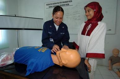 | Keywords: US Navy 050301-N-8629M-127 Hospital Corpsman 3rd Class Lynette Shute instructs Indonesian military and civilian nurses on cardio pulmonary resuscitation.jpg  en Banda Aceh Sumatra Indonesia Mar 1 2005 - Hospital Corpsman 3rd Class Lynette Shute assigned to the Military Sealift Command MSC hospital ship USNS Mercy T-AH 19 instructs Indonesian military and civilian nurses on cardio pulmonary resuscitation CPR at Tentera Nasional Indonesia Military Hospital in Banda Aceh Indonesia Mercy is serving as an enabling platform to assist humanitarian operations ashore in ways that host nations and international relief organization find useful Mercy is currently off the waters of Indonesia in support of Operation Unified Assistance the humanitarian relief effort to aid the victims of the tsunami that struck Southeast Asia U S Navy photo by Photographer's Mate 3rd Class Rebecca J Moat RELEASED 2005-03-01 050301-N-8629M-127 Navy http //www navy mil/view_image asp id 22364 U S Navy photo by Photographer's Mate 3rd Class Rebecca J Moat PD-USGov-Military-Navy Banda Aceh Hospital Corpsman |