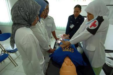 | Keywords: US Navy 050301-N-8629M-332 An Indonesian nurse practices cardio pulmonary resuscitation (CPR) under the instruction of Hospital Corpsman 3rd Class Lynette Shute.jpg  en Banda Aceh Sumatra Indonesia Mar 1 2005 - An Indonesian nurse practices cardio pulmonary resuscitation CPR under the instruction of Hospital Corpsman 3rd Class Lynette Shute during a CPR class taught by military members assigned to the Military Sealift Command MSC hospital ship USNS Mercy T-AH 19 at Tentera Nasional Indonesia Military Hospital in Banda Aceh Indonesia Mercy is serving as an enabling platform to assist humanitarian operations ashore in ways that host nations and international relief organization find useful Mercy is currently off the waters of Indonesia in support of Operation Unified Assistance the humanitarian relief effort to aid the victims of the tsunami that struck Southeast Asia U S Navy photo by Photographer's Mate 3rd Class Rebecca J Moat RELEASED 2005-03-01 050301-N-8629M-332 Navy http //www navy mil/view_image asp id 22365 U S Navy photo by Photographer's Mate 3rd Class Rebecca J Moat PD-USGov-Military-Navy Banda Aceh Hospital Corpsman |