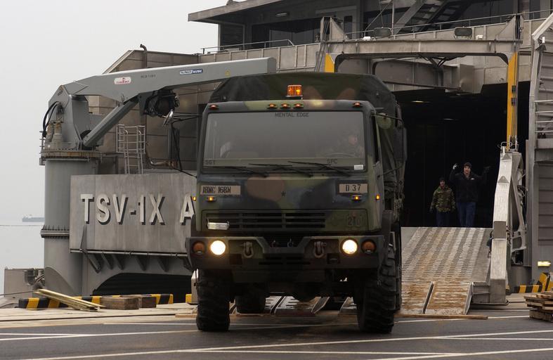 Keywords: US Navy 050315-F-9629D-079 A U.S. Army Light Medium Tactical Vehicle is loaded onto the U.S. Army^rsquo,s Theater Support Vessel TSV-1X Spearhead at Gwangyang Port Terminal, Republic of Korea.jpg en Gwangyang Port Terminal Republic of Korea Mar 15 2005 A U S Army Light Medium Tactical Vehicle is loaded onto the U S Army s Theater Support Vessel TSV-1X Spearhead at Gwangyang Port Terminal Republic of Korea The offload/on load is part of the first stages of Reception Staging Onward movement and Integration/Foal Eagle exercises RSO I/Foal Eagle RSO I is a complex multi-phase exercise conducted annually tailored to train test and demonstrate United States and Republic of Korea force projection and deployment capabilities Foal Eagle exercise runs simultaneously and trains in all aspects of Combined Forces Command's mission The TSV-1X deployed to Korea to support the exercises by high-speed movement of tactical combat equipment and troops around the peninsula U S Air Force photo by Staff Sgt Suzanne M Day RELEASED 2005-03-15 050315-F-9629D-079 Navy http //www navy mil/view_image asp id 22802 U S Navy photo PD-USGov-Military-Navy Images from US Navy location Gwangyang Port Terminal Republic of Korea Foal Eagle 2005 Family of Medium Tactical Vehicles |