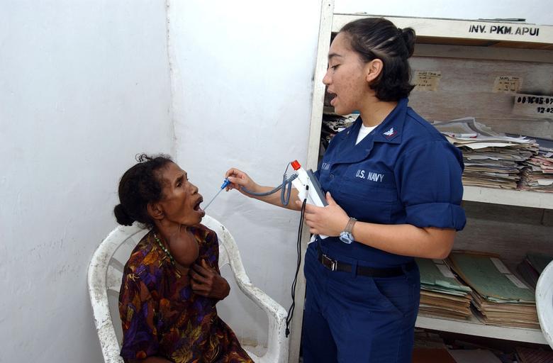 | Keywords: US Navy 050328-N-6665R-167 Hospital Corpsman Third Class Judith Quintana takes the temperature of an Indonesian patient at a clinic in the village of Apui, Indonesia.jpg en Alor Indonesia Mar 28 2005 - Hospital Corpsman Third Class Judith Quintana takes the temperature of an Indonesian patient at a clinic in the village of Apui Indonesia where medical professionals from Military Sealift Command MSC hospital ship USNS Mercy T-AH 19 are conducting assistance Mercy is currently off the coast of Alor Indonesia to provide humanitarian assistance and focus medical care to thousands of people displaced by a magnitude 7 3 earthquake that struck Nov 11 2004 While ashore Mercy's crew will focus on public health primary care dental treatment preventive medicine health education and pharmaceutical support Mercy's deployment is part of the U S commitment to Southeast Asia and the Pacific Island nations U S Navy photo by Photographer's Mate 2nd Class Jeffery D Russell RELEASED 2005-03-28 050328-N-6665R-167 Navy http //www navy mil/view_image asp id 23145 U S Navy photo by Photographer's Mate 2nd Class Jeffery D Russell PD-USGov-Military-Navy Images from US Navy location Alor Indonesia Aboard USNS Mercy T-AH-19 |