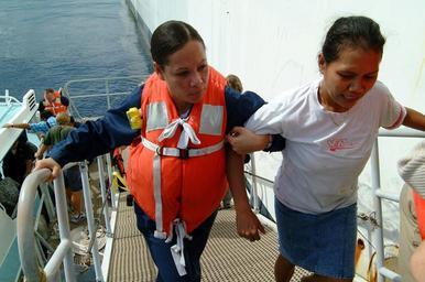 | Keywords: US Navy 050330-N-6504N-002 Hospital Corpsman 3rd Class Lynette Shute, left, helps an East Timorese woman up a boat ramp.jpg  en Dili East Timor Mar 30 2005 - Hospital Corpsman 3rd Class Lynette Shute left helps an East Timorese woman up a boat ramp leading into Military Sealift Command MSC hospital ship USNS Mercy T-AH 19 Several East Timorese were brought aboard Mercy for medical care Mercy is currently off the coast of Dili East Timor providing humanitarian assistance to the people of Dili While ashore Mercy's crew will focus on public health primary care dental treatment preventive medicine health education and pharmaceutical support Mercy's deployment is part of the U S commitment to Southeast Asia and the Pacific Island nations U S Navy photo by Journalist 3rd Class Isaac Needleman RELEASED 2005-03-30 050330-N-6504N-002 Navy http //www navy mil/view_image asp id 23182 U S Navy photo by Journalist 3rd Class Isaac Needleman PD-USGov-Military-Navy Aboard USNS Mercy T-AH-19 Healthcare in East Timor Hospital Corpsman United States Navy images from East Timor |