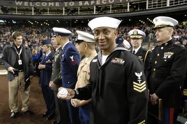 | Keywords: US Navy 050405-N-6477M-340 Hospital Corpsman 1st Class Jermaine K. Williams, assigned to Naval Hospital Bremerton, Wash., prepares to take the field to throw the first pitch during the Boeing Salute to Armed Forces Night at SAF.jpg  en Seattle Wash Apr 5 2005 Hospital Corpsman 1st Class Jermaine K Williams assigned to Naval Hospital Bremerton Wash prepares to take the field to throw the first pitch during the Boeing Salute to Armed Forces Night at SAFCO Field Seattle Wash The Mariners home season opening game was preceded by performances of the Joint Forces Band Northwest U S Marine Corps Drill Team parading of the colors by Joint Forces Color Guard and the presentation of a 72 x 48 foot U S Flag by the U S Coast Guard The U S Navy Band Vocal Quartet sang the National Anthem U S Navy photo by Photographer s Mate 2nd Class Eli J Medellin RELEASED 2005-04-05 050405-N-6477M-340 Navy http //www navy mil/view_image asp id 23417 U S Navy photo by Photographer s Mate 2nd Class Eli J Medellin PD-USGov-Military-Navy United States Navy in Seattle Washington Safeco Field Ceremonial first pitch Major League Baseball Hospital Corpsman Navy Band Northwest |