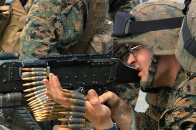 | Keywords: US Navy 050521-N-2468S-008 U.S. Marine Corps Lance Cpl. Howard Hoehmann, assigned to 2nd Fleet Anti-terrorism Security Team (FAST) Co., 3rd Platoon, takes aim at a target.jpg en South Pacific Ocean May 21 2005 - U S Marine Corps Lance Cpl Howard Hoehmann assigned to 2nd Fleet Anti-terrorism Security Team FAST Co 3rd Platoon takes aim at a target while conducting live fire machine gun drills aboard the U S Seventh Fleet flagship USS Blue Ridge LCC 19 The FAST Marines based on board Naval Weapons Station Yorktown Va are deployed aboard Blue Ridge currently underway in the South Pacific Ocean U S Navy photo by Photographer's Mate 2nd Class Terry Spain RELEASED 2005-05-21 050521-N-2468S-008 Navy http //www navy mil/view_image asp id 24627 U S Navy photo by Photographer's Mate 2nd Class Terry Spain PD-USGov-Military-Navy Aboard USS Blue Ridge LCC-19 M-240 machine gun 7 62 × 51 mm NATO ammunition belts Fleet Antiterrorism Security Team |