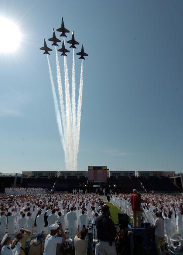 Keywords: US Navy 050527-N-9693M-003 The U.S. Navy Blue Angels flight demonstration team performs a fly-over during the opening ceremonies for the 2005 Graduation and Commissioning Ceremony at the U.S. Naval Academy.jpg en Annapolis Md May 27 2005 - The U S Navy Blue Angels flight demonstration team performs a fly-over during the opening ceremonies for the 2005 Graduation and Commissioning Ceremony at the U S Naval Academy Nine hundred seventy-six Midshipmen graduated from the U S Naval Academy and became commissioned officers in the U S Military President George W Bush delivered the commencement address and personally greeted each graduate during the ceremony The men and women of the graduating class were sworn into the Navy as Ensigns or into the Marine Corps as Second Lieutenants U S Navy photo by Damon J Moritz RELEASED 2005-05-27 050527-N-9693M-003 Navy http //www navy mil/view_image asp id 24769 U S Navy photo by Damon J Moritz PD-USGov-Military-Navy Flyovers in the United States Graduation and Commissioning Ceremony May 27 2005 Blue Angels F/A-18 Hornet in 2005