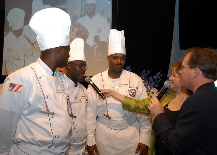 Keywords: US Navy 050529-N-7695R-142 Culinary Specialists 1st Class Alton Coleman, Christopher Jennings and James Flowers assigned to the USS John F. Kennedy (CV 67) share food secrets with the hosts of the 2005 Fleet Week Best Chow comp.jpg en New York N Y May 29 2005 - Culinary Specialists 1st Class Alton Coleman Christopher Jennings and James Flowers assigned to the USS John F Kennedy CV 67 share food secrets with the hosts of the 2005 Fleet Week Best Chow competition held aboard the display ship USS Intrepid The Best Chow judging was conducted by various civilian and military chefs from around the world U S Navy photo by Photographer's Mate Airman Anthony Riddle RELEASED 2005-05-29 050529-N-7695R-142 Navy http //www navy mil/view_image asp id 24857 U S Navy photo by Photographer's Mate Airman Anthony Riddle PD-USGov-Military-Navy Fleet Week New York 2005 Culinary specialist United States Navy Aboard USS John F Kennedy CV-67 Chef's hat