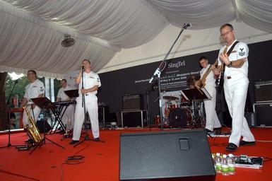 | Keywords: US Navy 050603-N-0493B-001 The Seventh Fleet Band performs at the Singapore Street Festival.jpg en Singapore June 3 2005 - The Seventh Fleet Band Orient Express performs at the Singapore Street Festival The band is in Singapore taking part in exercise Cooperation Afloat Readiness and Training CARAT 2005 with the Republic of Singapore Navy CARAT is a regularly scheduled series of bilateral military exercises with various Southeast Asian nations designed to enhance interoperability of the respective sea services and includes a variety of operational social and community events U S Navy photo by Lt Chuck Bell RELEASED 2005-06-03 050603-N-0493B-001 Navy http //www navy mil/view_image asp id 25047 U S Navy photo by Lt Chuck Bell PD-USGov-Military-Navy Naval ships of the United States in Singapore |