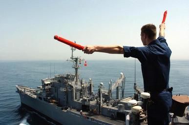 | Keywords: US Navy 050604-N-9446C-045 Quartermaster 2nd Class Kyle Vanduzor aboard the Nimitz-class aircraft carrier USS Carl Vinson (CVN 70), transmits a message to fast combat support ship USS Camden (AOE 2).jpg  en Persian Gulf June 4 2005 - Quartermaster 2nd Class Kyle Vanduzor aboard the Nimitz-class aircraft carrier USS Carl Vinson CVN 70 transmits a message to fast combat support ship USS Camden AOE 2 through the use of Semaphore visual communication during an underway replenishment UNREP The Carl Vinson Carrier Strike Group is currently deployed conducting operations in support of multi-national forces in Iraq and maritime security operations in order to set the conditions for security and stability in the region Vinson will end its deployment with a homeport shift to Norfolk Va and commence a three-year refuel and complex overhaul U S Navy Photo by Photographer's Mate 3rd Class Refugio Carrillo RELEASED 2005-06-04 050604-N-9446C-045 Navy http //www navy mil/view_image asp id 25060 U S Navy Photo by Photographer's Mate 3rd Class Refugio Carrillo PD-USGov-Military-Navy USS Camden AOE-2 Flag semaphore Signals underway replenishment  |