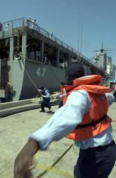 Keywords: US Navy 050606-N-9866B-041 Line handlers from the amphibious assault ship USS Peleliu (LHA 5) pull in a mooring line as they secure the amphibious dock landing ship USS Rushmore (LSD 47) to the pier.jpg en San Diego Calif June 6 2005 - Line handlers from the amphibious assault ship USS Peleliu LHA 5 pull in a mooring line as they secure the amphibious dock landing ship USS Rushmore LSD 47 to the pier Rushmore is returning six-month deployment in support of tsunami relief efforts in Southeast Asia and operations in the Persian Gulf U S Navy photo by Journalist 2nd Class Zack Baddorf RELEASED 2005-06-06 050606-N-9866B-041 Navy http //www navy mil/view_image asp id 25167 U S Navy photo by Journalist 2nd Class Zack Baddorf PD-USGov-Military-Navy Naval ship arrivals to Naval Base San Diego Aboard USS Rushmore LSD-47 |