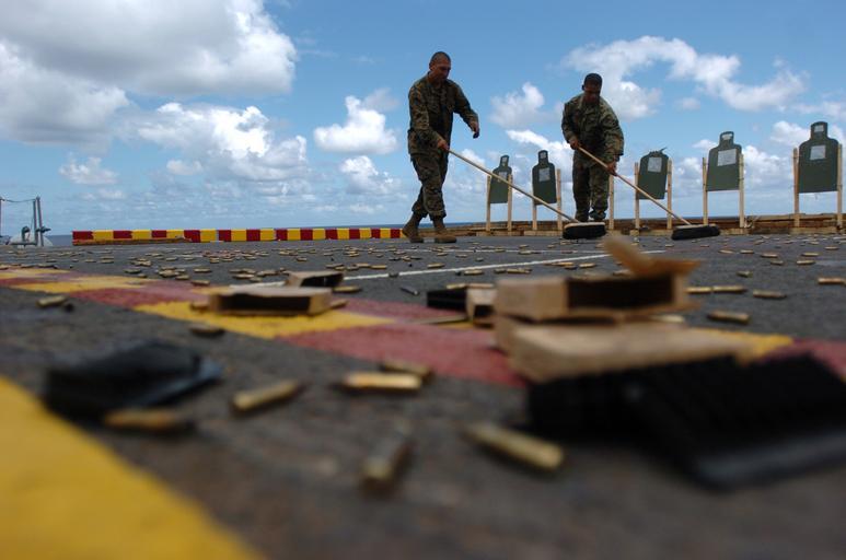 Keywords: US Navy 050623-N-9866B-037 Two Marines, assigned to the 3rd Amphibious Assault Battalion based at Camp Pendleton, Calif., sweep up spent shell casings.jpg en Pacific Ocean June 23 2005 - Two Marines assigned to the 3rd Amphibious Assault Battalion based at Camp Pendleton Calif sweep up spent shell casings after an M-16 live fire weapons exercise aboard the amphibious assault ship USS Peleliu LHA 5 U S Navy photo by Journalist 2nd Class Zack Baddorf RELEASED 2005-06-23 050623-N-9866B-037 Navy http //www navy mil/view_image asp id 25629 U S Navy photo by Journalist 2nd Class Zack Baddorf PD-USGov-Military-Navy Aboard USS Peleliu LHA-5 Cartridge cases 3rd_Assault_Amphibian_Battalion |