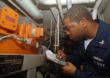 | Keywords: US Navy 050713-N-4374S-002 Gas Turbine System Technician 3rd Class Travis Buchanon logs a reading from a hydraulic oil power module for a control reversible pitch propeller in Main Engine Room Two.jpg en Pacific Ocean July 13 2005 - Gas Turbine System Technician 3rd Class Travis Buchanon logs a reading from a hydraulic oil power module for a control reversible pitch propeller in Main Engine Room Two aboard the guided missile cruiser USS Thomas S Gates CG 51 Thomas S Gates is part of a multinational naval and coast guard force from six nations conducting UNITAS 46-05 Pacific Phase off the coasts of Colombia The Colombian Navy in this year s UNITAS Pacific Phase hosts Ecuador Panama Peru and the United States During the two-week exercise participating units have the opportunity to train as unified force in all aspects of naval operations from maritime interdiction to anti-submarine and electronic warfare U S Naval Forces Southern Command sponsors UNITAS exercises with the objective to foster cooperation and develop interoperability among the navies of the region U S Navy photo by Photographer s Mate 2nd Class Michael Sandberg RELEASED 2005-07-13 050713-N-4374S-002 Navy http //www navy mil/view_image asp id 26225 U S Navy photo by Photographer s Mate 2nd Class Michael Sandberg PD-USGov-Military-Navy Gas Turbine System Technicians USS Thomas S Gates CG-51 Engine rooms of the United States Navy |