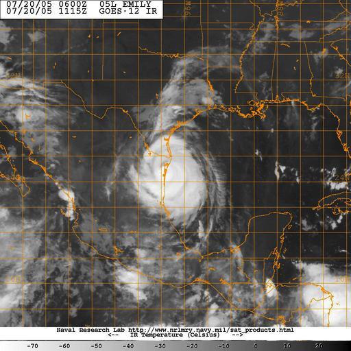 Keywords: US Navy 050720-N-0000W-002 Satellite image taken from the GOES-12 satellite of Hurricane Emily.jpg en Gulf of Mexico July 20 2005 - Satellite image taken from the GOES-12 satellite of Hurricane Emily At 11 p m EDT 0300 GMT the storm's center was 120 miles southeast of Brownsville Texas and moving west-northwest at a slow 7 mph 11 kph Emily is a dangerous category three hurricane on the Saffir-Simpson scale with maximum sustained winds near 125 mph 205 km/hr Emily's center was expected to hit land some 150 miles south of the U S Mexico border near low-lying fishing communities Heavy rain was seen likely in mountainous regions further inland and forecasters warned of life-threatening flash floods and mudslides Emily killed five people in Jamaica in its swing through the Caribbean as a Category 4 hurricane and several people died in Mexico in incidents indirectly caused by the storm The storm was set for its second landing on Mexico after dropping into the Caribbean coast on Monday sending tourists and locals to shelters in beach resorts in and around Cancun Mexican oil exports were suspended and not set to restart until Wednesday after oil operations in the southern Gulf of Mexico were halted due to the hurricane U S Gulf of Mexico oil and natural gas producers expected little to no damage U S Navy photo RELEASED 2005-07-20 050720-N-0000W-002 Navy http //www navy mil/view_image asp id 26342 U S Navy photo PD-USGov-Military-Navy Satellite pictures of the Gulf of Mexico Satellite pictures of hurricanes GOES 12 pictures |