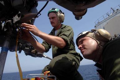Keywords: US Navy 050724-N-5526M-004 Aviation Electrician's Mate 2nd class Nicholas Dixon, and Aviation Machinists Mate 1st class Joshua Miller checks the rotor assembly on a SH-60 Seahawk helicopter aboard the guided missile cruiser US.jpg en Persian Gulf July 24 2005 - Aviation Electrician's Mate 2nd class Nicholas Dixon and Aviation Machinists Mate 1st class Joshua Miller assigned to the Jaguars of Helicopter Anti-Submarine Squadron Light Six Zero HSL-60 checks the rotor assembly on a SH-60 Seahawk helicopter aboard the guided missile cruiser USS Philippine Sea CG 58 Philippine Sea and HSL-60 are participating in joint exercise Nautical Union conducting Maritime Security Operations MSO training air defense anti-submarine warfare surface warfare mine counter measures electronic warfare replenishment at sea RAS and command and control Maritime Security Operations MSO is aimed at setting the conditions for security and stability in the maritime environment Illicit activity at sea has a global impact U S Navy photo by Photographer s Mate 1st class Robert R McRill RELEASED 2005-07-24 050724-N-5526M-004 Navy http //www navy mil/view_image asp id 26599 U S Navy photo by Photographer s Mate 1st class Robert R McRill PD-USGov-Military-Navy Aviation Electrician's Mate Aboard USS Philippine Sea CG-58 Helicopter Anti-Submarine Squadron Light 60 United States Navy SH-60B Seahawk Photographs by Robert R McRill |