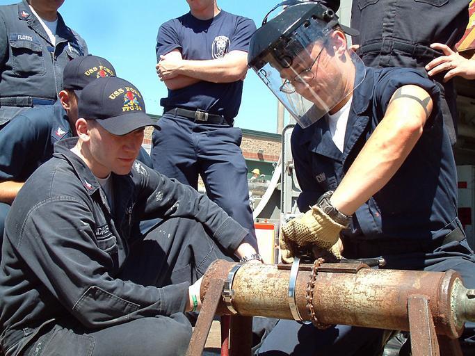 Keywords: US Navy 050727-N-8825R-011 Hull Technician Fireman Brandon Jackson, right, and Damage Controlman 3rd Class Seth Lindauer demonstrate pipe-patching techniques.jpg en Everett Wash July 27 2005 - Hull Technician Fireman Brandon Jackson right and Damage Controlman 3rd Class Seth Lindauer demonstrate pipe-patching techniques and other vital damage control scenarios in preparation of the Command Assessment and Readiness Training CART evaluation phase two aboard the guided-missile frigate USS Ford FFG 54 The crew of the Perry-class frigate is undergoing a rigorous training cycle in preparation for its upcoming deployment to South America U S Navy photo by Photographer's Mate 3rd Class Aramis Ramirez RELEASED 2005-07-27 050727-N-8825R-011 Navy http //www navy mil/view_image asp id 26976 U S Navy photo by Photographer's Mate 3rd Class Aramis Ramirez PD-USGov-Military-Navy Naval Station Everett USS Ford FFG-54 |